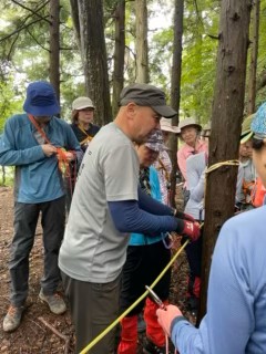 高水山にて昼食のあとロープワーク。カラビナ通過、プルージック通過を学ぶ。Oサブリーダーが、どういう場面で何のために使うのか、と丁寧に説明下さり分かりやすかった。