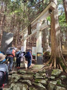 三峰山駐車場を10時過ぎスタート、鳥居をくぐると杉林と広葉樹が交互に続く穏やかな登りが続きます。