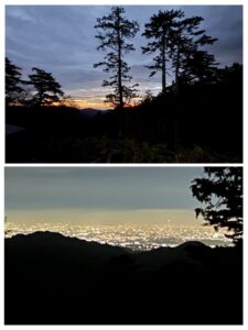 やがて朝日で空が真っ赤に染まり、幻想的な赤い陽が木々を照らす、素晴らしい!