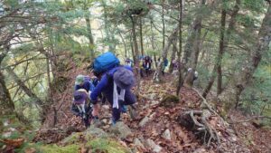 美しいブナに見とれ進む先には、まさかの強烈な登りが待ち構えていて、むき出しの木の根っこや岩にヒーヒーいいながら白岩山へ。