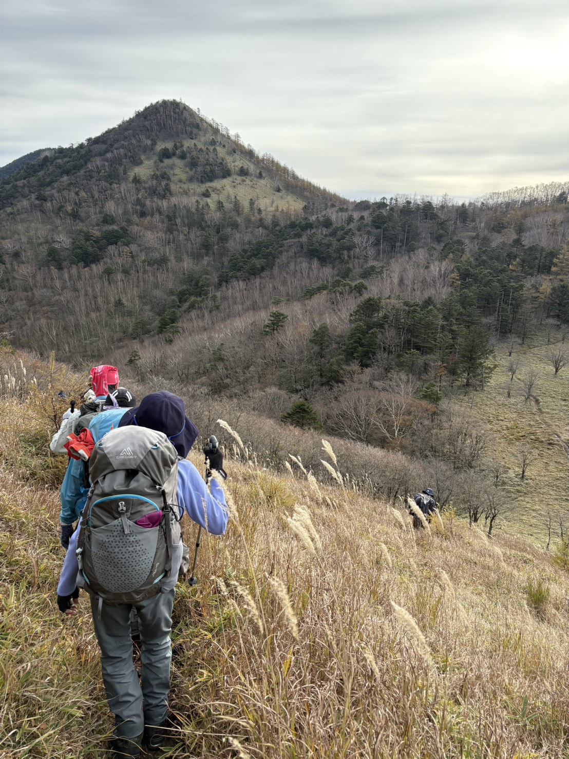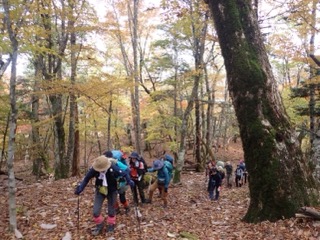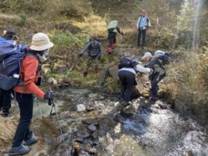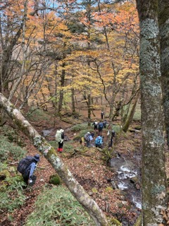 雁峠から沢沿いを下るが、数ヶ所ある渡渉ポイントが不明瞭だった。ここで、リーダーと経験豊富なFさんがルートファインディングして下さる。その他のメンバーもただついて行くのではなく、自分の目で確認して声を掛け合い、安全に渡渉できるポイントを探した。無事に通過して川沿いの紅葉を見上げた時、一致団結して渡り切った充実感でいっぱいになった。