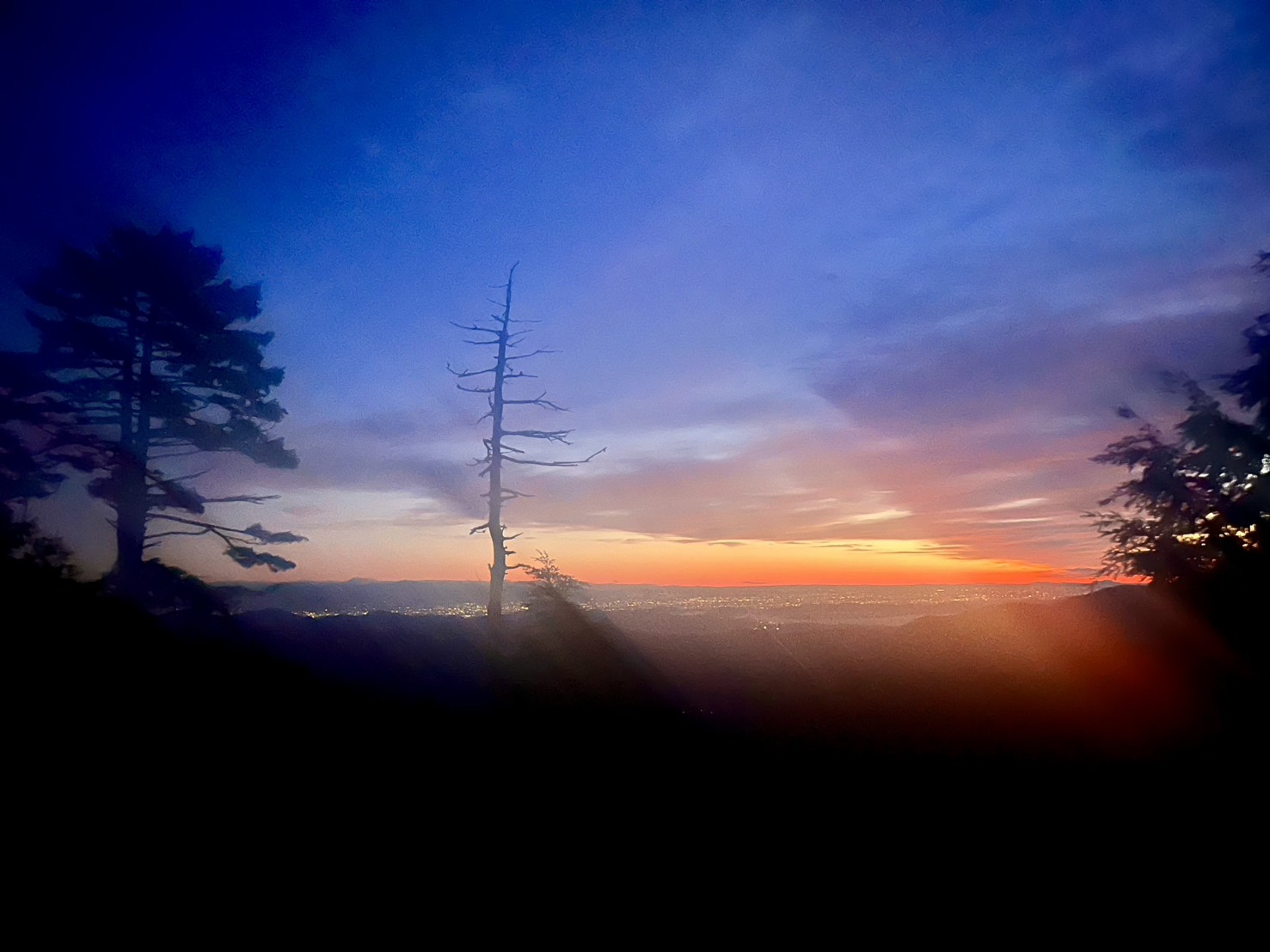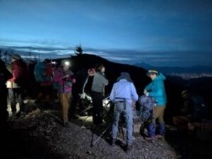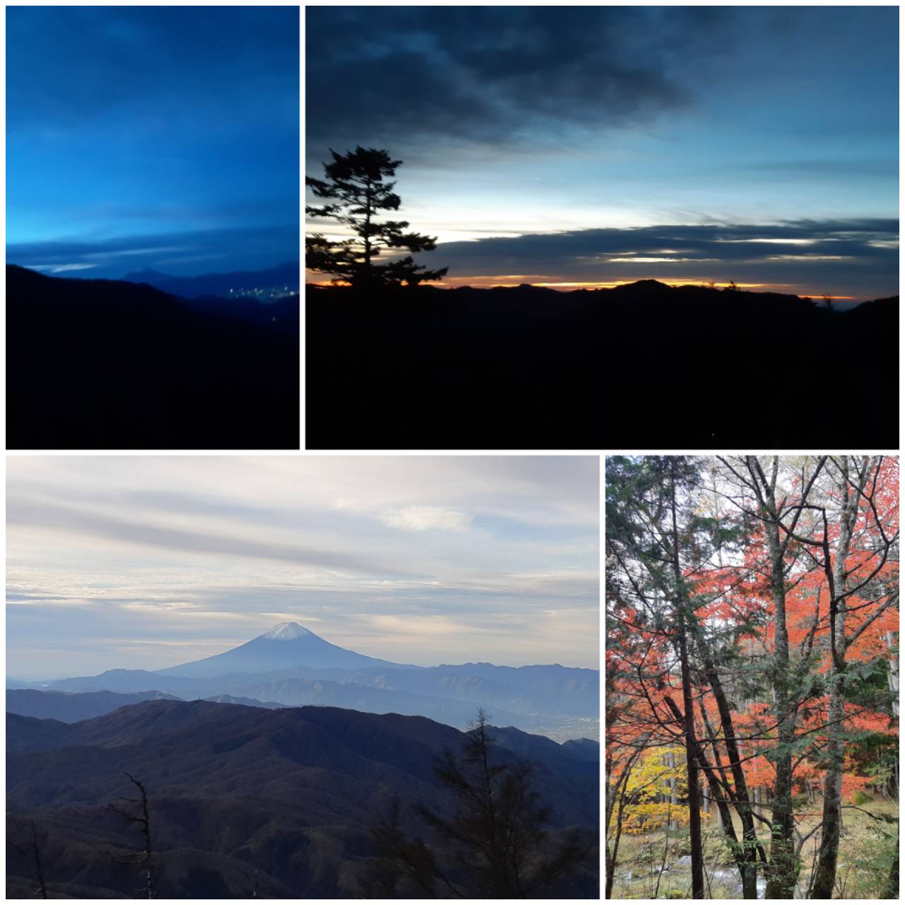 2日目の出発は、未だ暗く星が瞬く。登るにつれ、街の灯りがキラキラ輝き、朱色と濃いオレンジ色に染まる空が、どんどん広がっていく。雁坂峠から見える富士山は裾野が長く延び、歓声が上がる。ここからの稜線は素晴らしい眺めが続き、皆んなの足どりも軽やかだ。