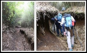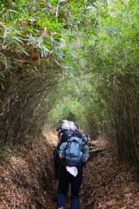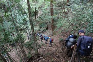 午後のコースは足柄林道に出るまで急な下り坂が続き、林道を経て塔ノ峰に登り返す。途中あまり知られていない「弾誓上人の窟屋」に寄り道し、多種類の椿と皇女和宮ゆかりの寺、阿弥陀寺に到着。参拝後、舗装道路をひたすら下り箱根湯本駅に到着、散会しました。変化に富んだ楽しいコースの山行でした。最後にリーダー、サブリーダーをはじめ参加者の皆さんに感謝します。