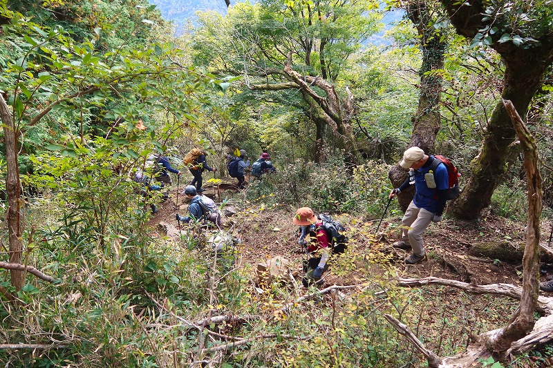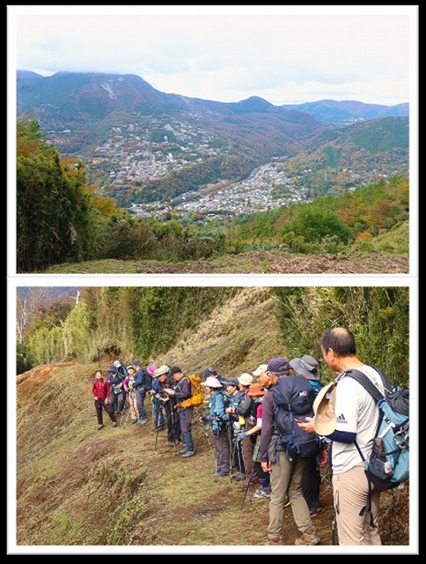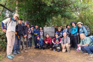身支度を整え、いよいよ出発。箱根の紅葉を堪能しながら車道を歩き、明星ヶ岳登山口に到着。道標の傍らに熊出没注意の看板もあり、少し緊張しましたが、登山開始。いきなりの急登に驚きながら、篠竹に囲まれた、木の根の道をひたすら登り、箱根大文字焼が行われる場所に到着。あいにくの曇り空で、大涌谷の湯気もほとんど見れず残念。水取休憩後に出発、11時35分明星ヶ岳山頂に到着。昼食休憩後、全員で写真撮りタイム。「はいチーズ、バター」と、いつもの楽しいひと時です。