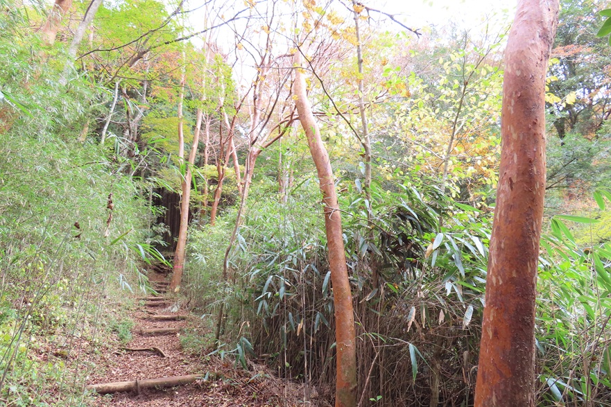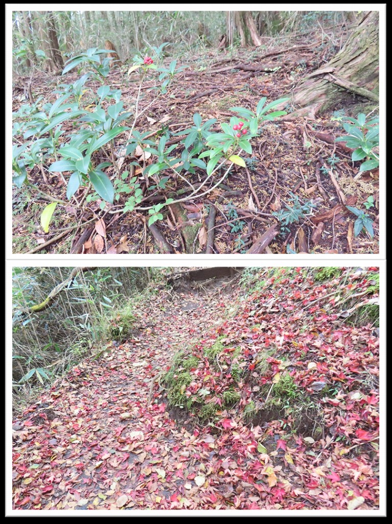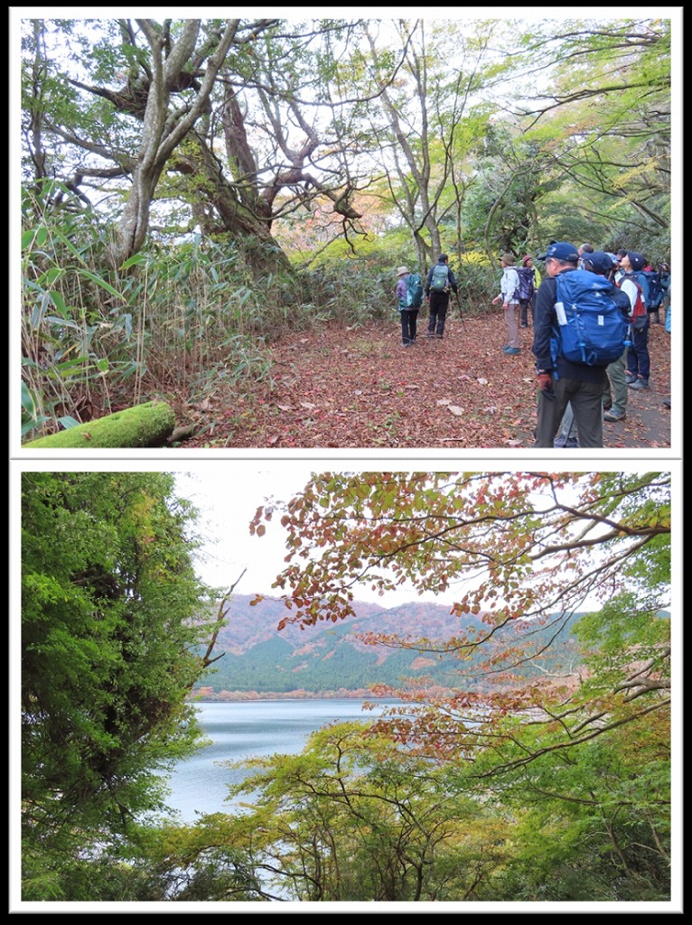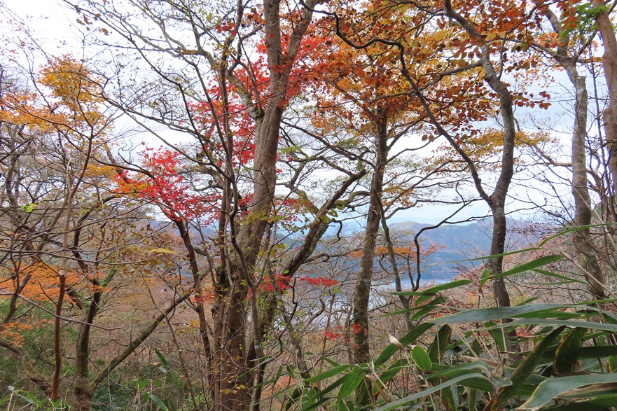 芦ノ湖畔のセラピーロードで足慣らししたあとは、いよいよ防ヶ沢登山道へ入ります。9年ぶりに規制解除された道は、思いのほか、よく整備されていて、前半は、真っ盛りの紅葉や、マユミ、ミヤマシキミの実を見ながらのハイキング気分で盛り上がります。後半になると急登も増えてきて、登山モードにシフトチェンジ。上り一辺倒の道を2時間以上登り詰めて、ようやく山頂へたどり着いた時には、「Cにしといて良かった、Dに近いも要らないか」などの思いがよぎります。