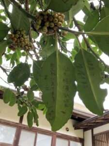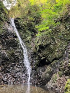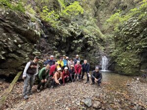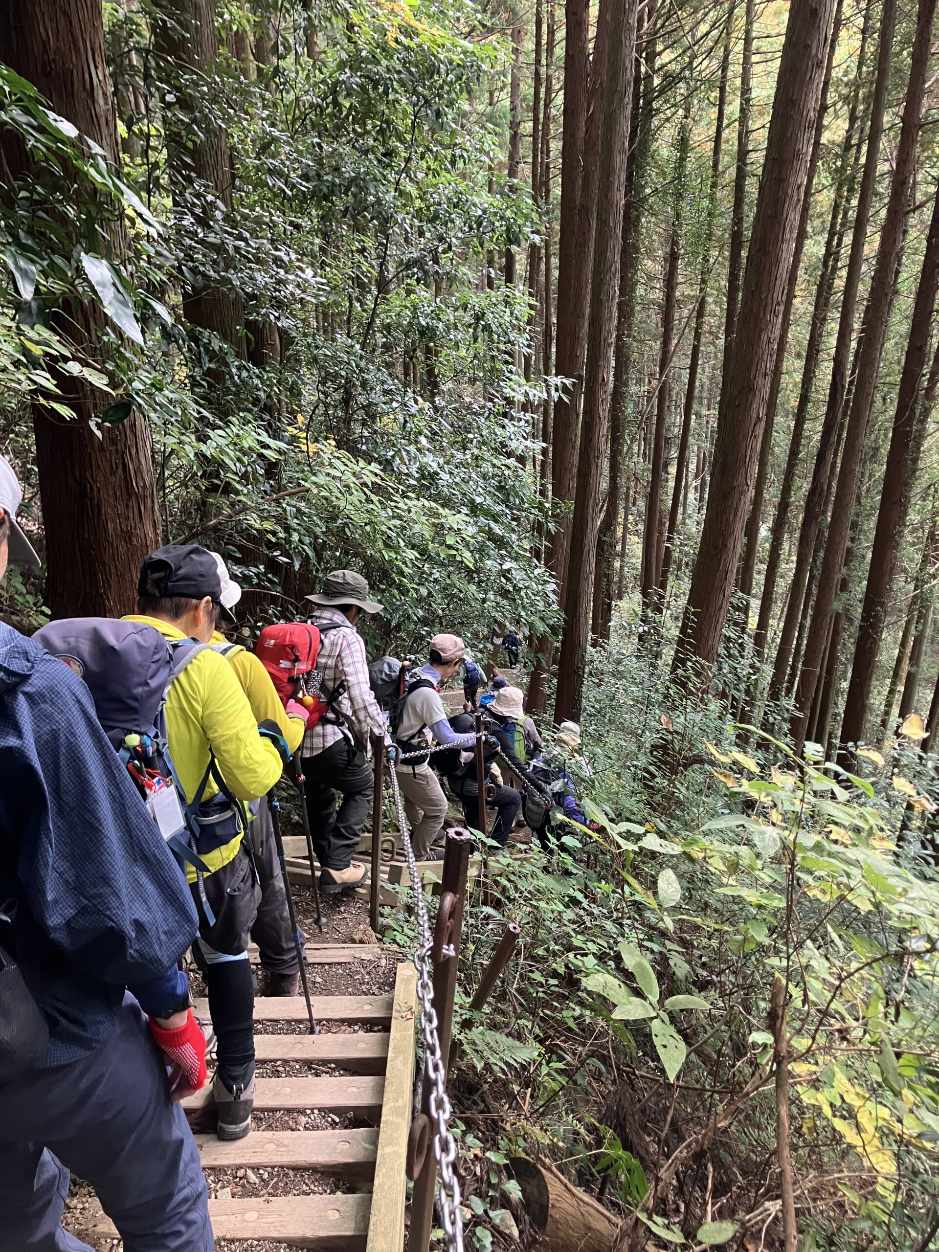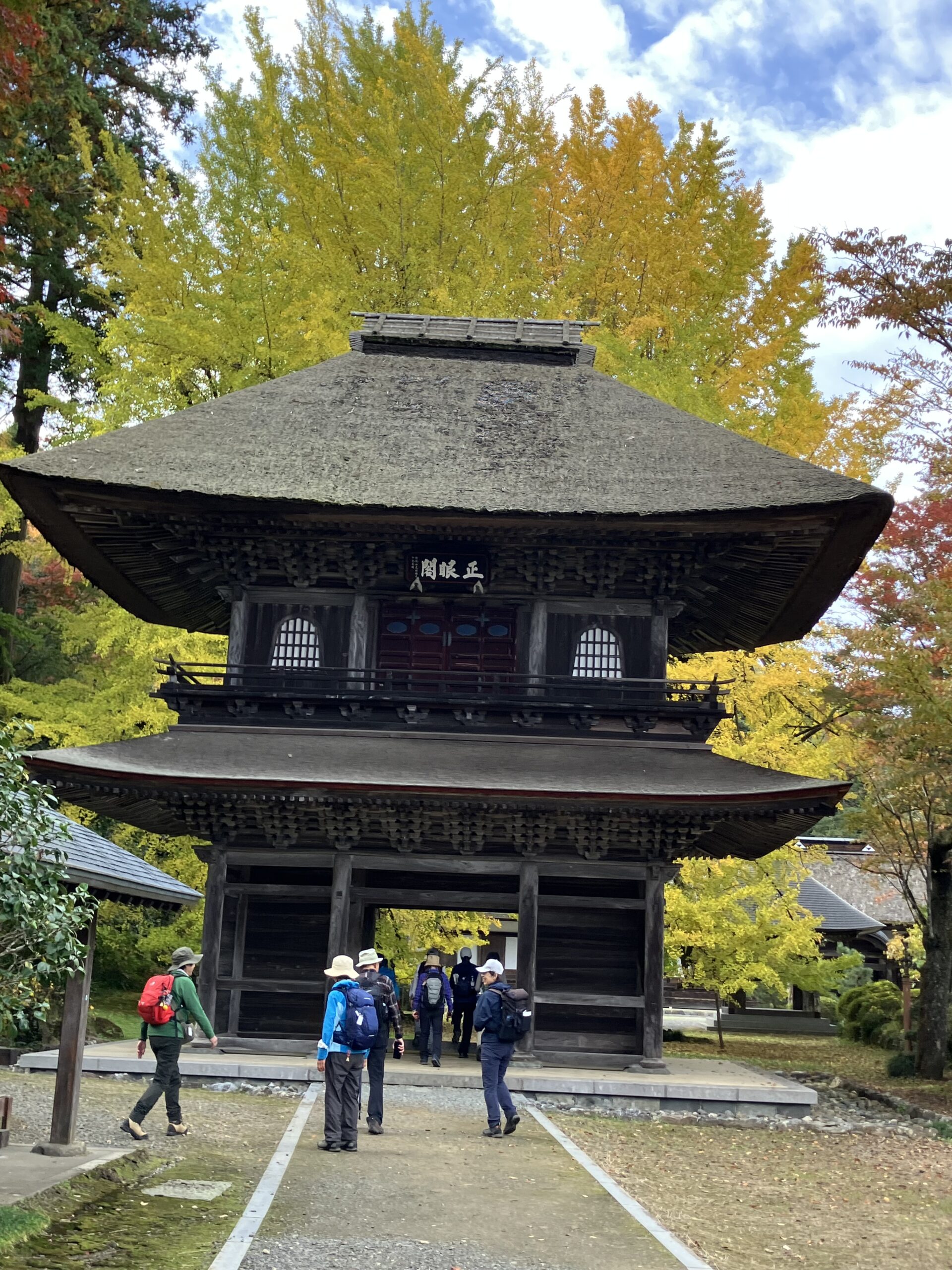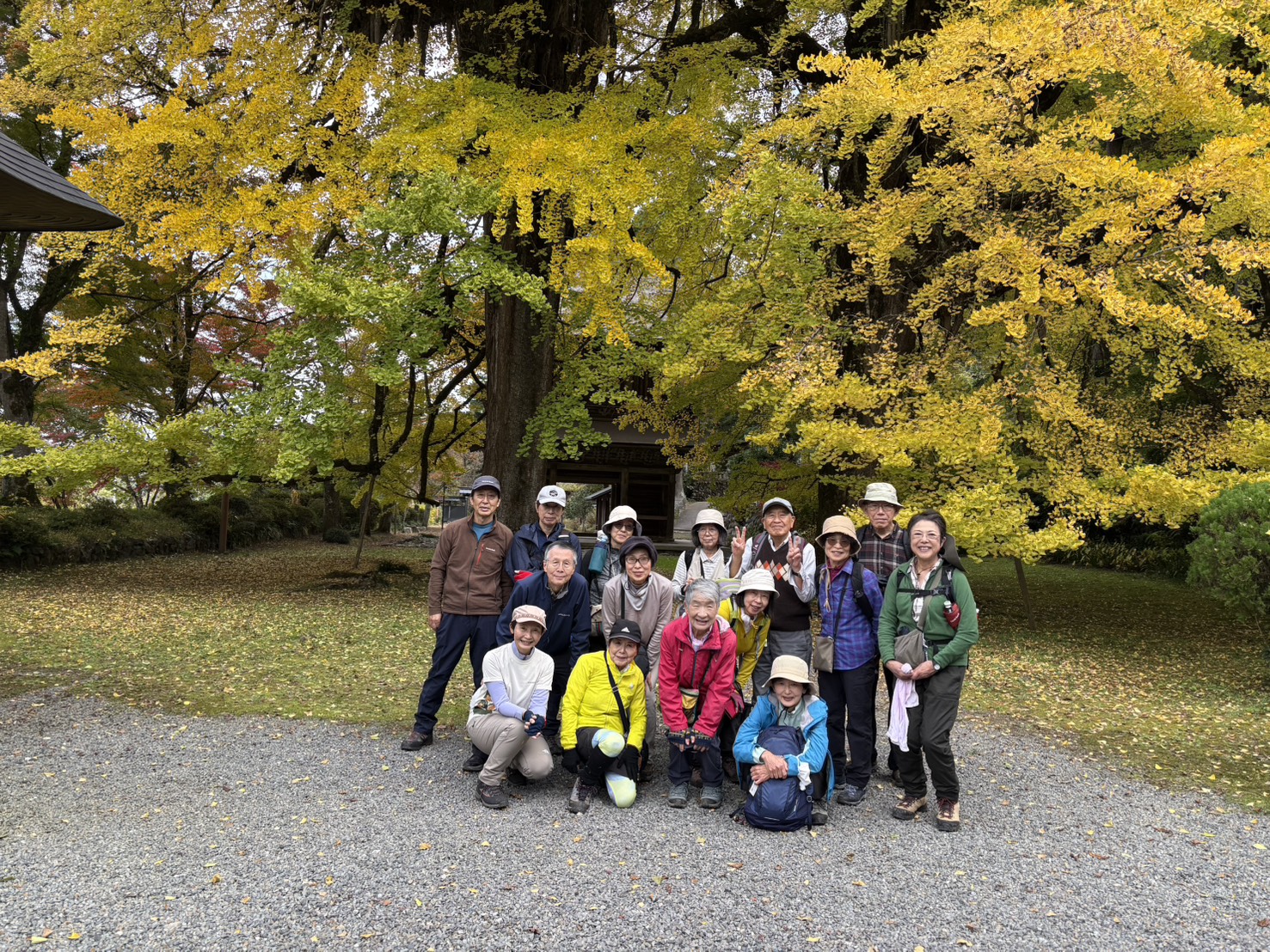 秋川丘陵の小峰公園からどんぐりが落ちている雑木林を心地よく歩き、急な階段を降りて金剛の滝に到着。雌滝の前で集合写真を撮り、その後トンネルをくぐって雄滝へ、落差18mの優美な滝でした。9月にこの辺りで熊が出たとのことであるが、リーダーは熊対策用に持参されていた鉄砲(ダイソーで購入)を発砲デモンストレーション、大きな音がして、実際使えるなぁと思った。もう一つの目的地の広徳寺は1373年に創建された臨済宗建長寺派の由緒あるお寺で、二本の大イチョウ、カヤ、タラヨウの大木が有名。タラヨウは葉の裏に文字を書くことができ昔は通信手段に使われ「ハガキ(葉書)」の語源になったとリーダーから説明があり、実際葉の裏を見てみるといっぱい文字が書かれていた。