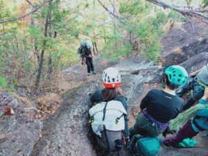 岩場の横では、30mのロープで懸垂下降の練習。懸垂下降の経験が少ない2人にATCへのロープのセッティングの仕方、L字の姿勢など初心者レベルを綿貫リーダーが教えているのを見て、本当にこの2人も、今日猿岩懸垂下降するのと少し思いました。「一旦経験不足で参加を断られましたが、人数が少ないので数日前に参加OKをもらいました」と喜んでました。