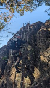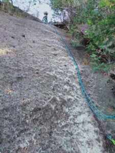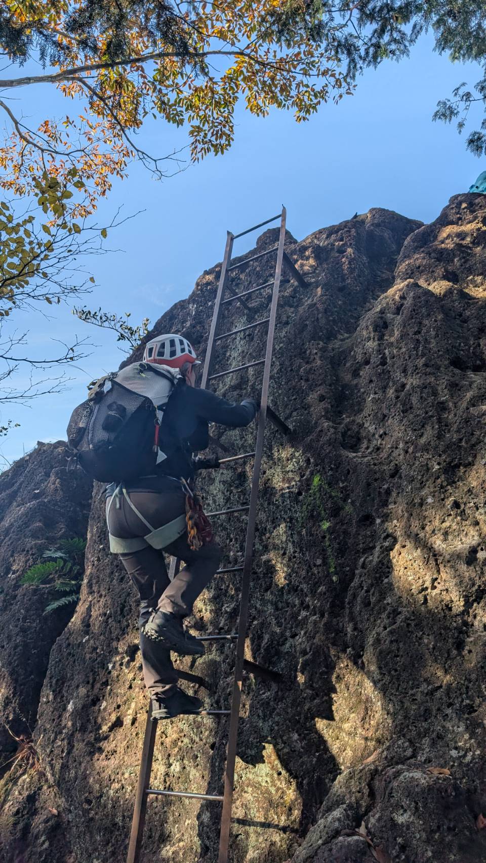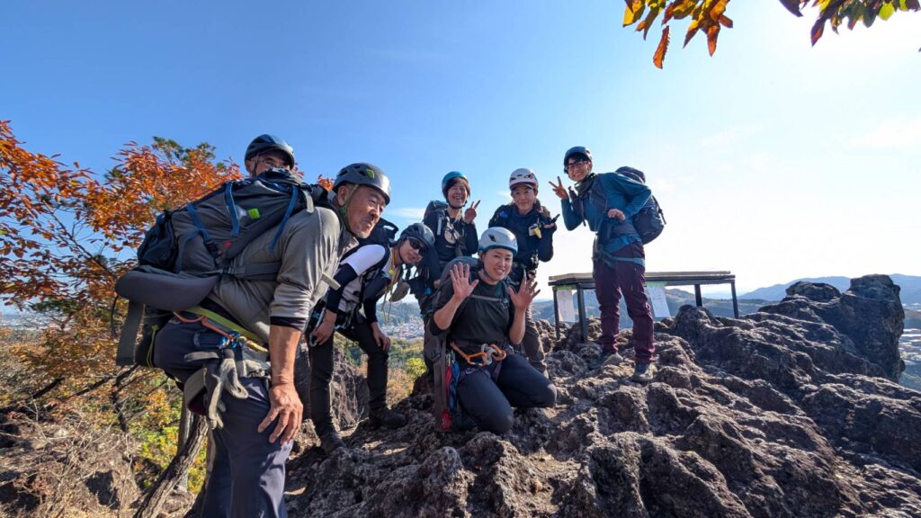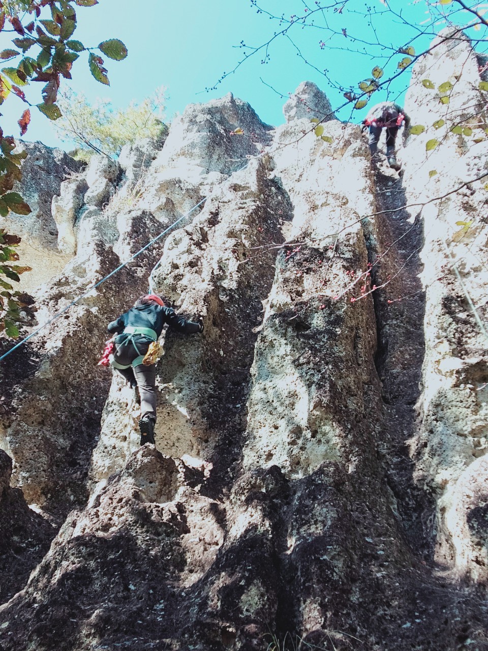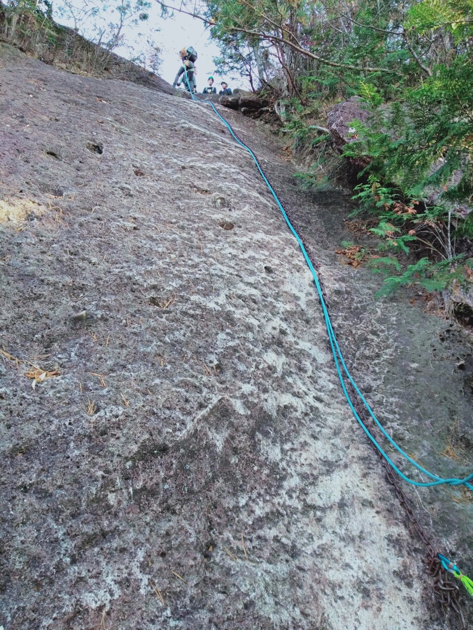 日吉神社から20分程の岩場に、50mロープ2本張り、鹿沼岩トレ初めての人がほとんどながら、全員登山靴で1発で完登。私は、15m程と高度感もあり壁の角度も急で恐る恐る登りました。すごくザラザラで滑りにくい岩だったので助かりました。降りる時は縦に深い切れ目の中にロープは張られているので、普通にテンションをかけてもらって降りると両側の岩にぶつかりそうで、クライムダウンのようになってしまいました。