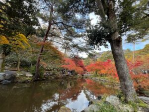 黄に染まり、池はそれらを映す合わせ鏡のよう。混雑する庭を多くの見物客と