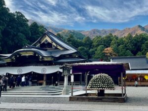 静まり返り、格調高い本殿の向こうに紅葉の弥彦山がそびえている。明日が楽
