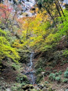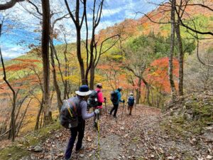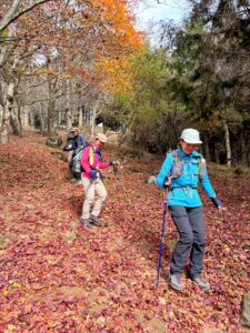 妻坂峠で少し休憩したあと、きれいな紅葉とリーダーの童謡ハミングに癒されながら下山した。