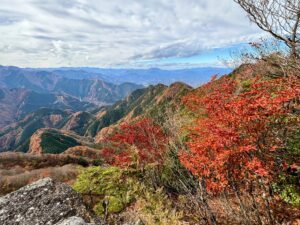 大持山へ向かう途中の雨乞岩は絶景ポイント。眼下に広がる山々は常緑樹と落葉樹のパッチワークだった。