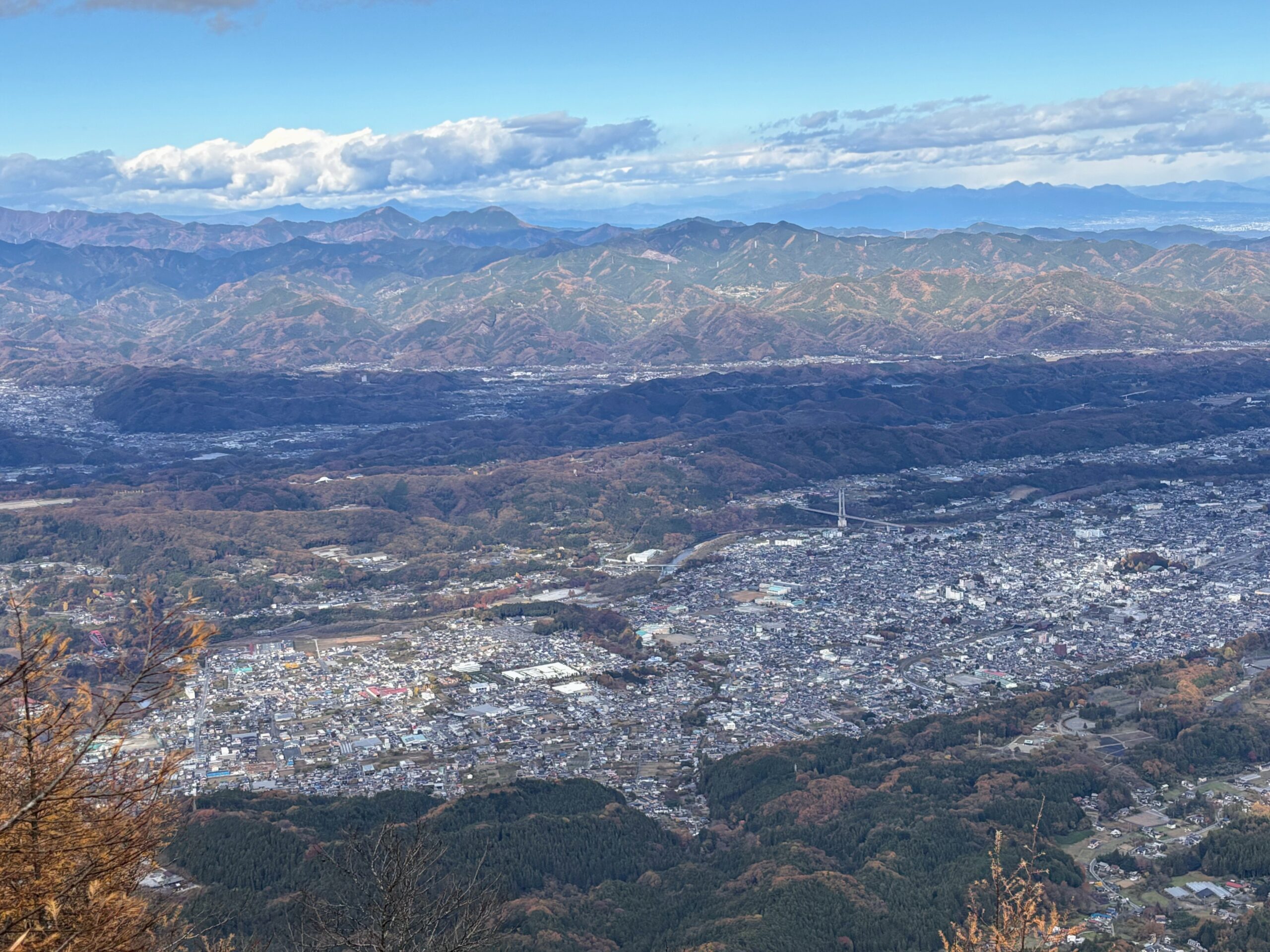 全員が交代で先頭を歩かせてもらい、ワイワイやっている間に山頂へ到着。曇り空ではあったが、秩父市街の向こうに両神山や榛名山、四阿山、赤城山らしき山も見えた。