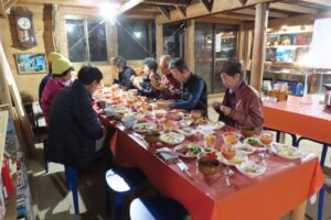 さて、いよいよ噂の夕食時間となり、その品数、ボリュームに、全員しばし圧倒されてしまいます。途中、自己紹介もまじえての2時間の夕食でしたが、時間があっても完食はできません。小屋泊り初体験の人への「ここが普通の山小屋と思っちゃダメよ」の声に、全員「ウンウン」とうなずきます。