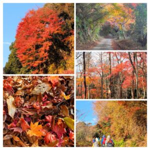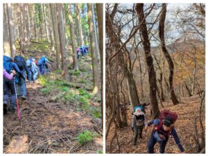 まだまだ綺麗な紅葉の下、始めは林道歩き。途中林道を何度かショートカットするが、その度に必ず各自地図を用意。そして班ごとに、リーダーが、これから登る尾根やピーク、目印の鉄塔や待機地点をを確認してくれる。しかしこのショートカットが、なかなかの急登バリルート。林道に出る度にほっとし、かなり汗(冷汗?)をかいていることに気付き、衣料調整も忙しい。でも、楽しい!
