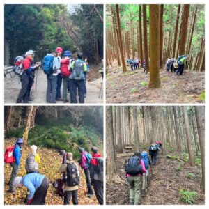 林道での休憩後、本日のメイン、勘太郎山ルートを通り番ヶ平へ。(吉備人地図にのみ記載、「道標なし、熟達者向け」とある!)林の中、土が軟らかく足を踏ん張れない。アキレス腱がぴーんと伸びきるような急登を、歩きやすいルートを探しながら、皆静かに登っていく。木の葉と土の匂い。時々、鹿の声が聞こえてくる。緩やかな場所に出ては一息。その繰り返しが続く。やっと勘太郎山手前まで来た。早めの昼食後、30分ほど歩いた番ヶ平で一般ルートに合流した…ホッ。