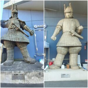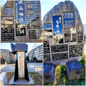 多摩川原橋を渡り、再度雄大な多摩川を眼下にみて左岸に戻ります。かつては映画の街だった調布です が、昨今は映画の勢いも衰え、映画のスタジオもゴルフ場に代わったりしました。それでも今もスタジオとして残っている「角川大映スタジオ」を訪れました。入口には優しい大魔神と怒った大魔神の巨大な2像があり、思わず懐かしさが込み上げてきます。スタジオの近くには「調布映画発祥の碑」と「映画俳優の碑」があり、池辺良、坂東妻三郎、大河内伝次郎、長谷川一夫、田中絹代、三船敏郎、石原裕次郎、高倉健、八千草薫等々懐かしい名前が数多く刻まれていました。