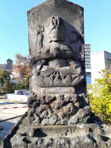 稲城大橋から下流に向けた右岸の多摩川沿いは野鳥の巣が数多くあるため通行禁止になっていますが、 そのため岸辺近くにはうっそうとした森が延々と続き、山の中を歩いているような錯覚に陥ります。森 を抜け多摩川原橋を越えると沢山の馬頭観音が一堂に並んでいる馬頭観音塔像がありました。