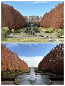シンメトリックのフランス式庭園を囲むように、高さ約30m・約100本のメタセコイアがレンガ色に染まり映えています。