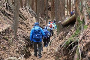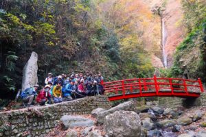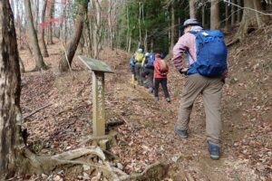 無事、本来のルートに戻れたものの、今季一番の寒さに見舞われ防寒用衣類調整をした。15世紀末、足柄峠越えの監視のために築城されたという浜居城址後での昼食休憩もそこそこに、酒水の滝へと向かった。