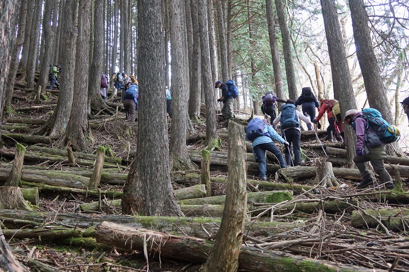 一抹の不安を頂きながら林の中の道を進み、難無く立入禁止マークの所を通過したなと安堵したのも束の間、崩落個所が在り、急遽、踏み跡無き急登を登ることになった。これぞ、おいらく山行。