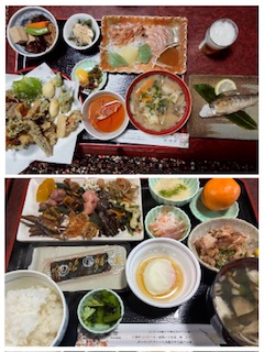 陣場ヶ原分岐に詰め沢履を脱ぎ、やっとランチタイム。旧中山道を、車を停めためがね橋まで下山。玉屋ドライブインまで移動して宿のご主人のお迎えの車に乗り換えて金湯館に到着。金湯館は源泉掛け流しの温泉が素晴らしく湯量が豊富で、飲むことはもちろん、洗面からトイレの水まで全て暖かい温泉。温泉満喫でした。平日で私たち以外には4連泊していると言う男性客1人だった事もあり、3間続きの大広間に炬燵2台、ふかふかお布団にはあんかまで入れて頂き至れり尽くせり。夕食は名物の14種類の季節の天ぷら。朝食もおかずたっぷりで美味しいご飯も入らないほどの大満足でした。お酒のメニューに骨酒が!なにそれ?って初体験の人も、こんがり焼いたイワナが丸ごと入って香ばしいお酒を堪能しました。ご主人、奥様もとても感じ良く、おすすめのお宿です。