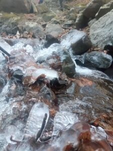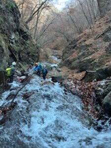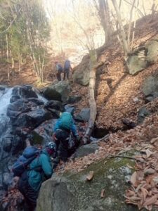 2日間ともお天気に恵まれ、初日の沢歩きでもそれほど寒さを感じる事はありませんでした。碓氷川はナメ・ナメ滝が多く脇を巻いて行けばほとんど濡れずに気持ち良く歩けます。ただ、ヌメっていて滑りやすい岩が多く、転んでびしょ濡れは避けたい・・・油断は出来ずでした。上流に進んで行くと霜柱があったり、落ち葉の上や水の流れのある所でも凍っていたのでさすがに水温低かったですね。途中落ち葉が溜まっている所があり、落ち葉のプールの中を泳ぐように進んだ時はみんなで大笑い。楽しい泳ぎ沢でした。