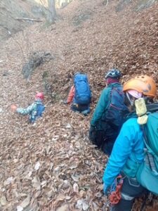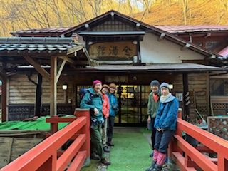 途中の木にあった熊の爪痕を見損ね、また見つけたら絶対教えてと指令を出すリーダー(結局その後にはありませんでしたが)、宿出発時に、私たち山岳会のエキスパートなのでとなんだかプレッシャーを掛けるサブリーダー。愉快なメンバーでおしゃべりしながら、またまた深い落ち葉を掻き分けての下山。もう一度温泉で温もって東京まで帰路につきました。