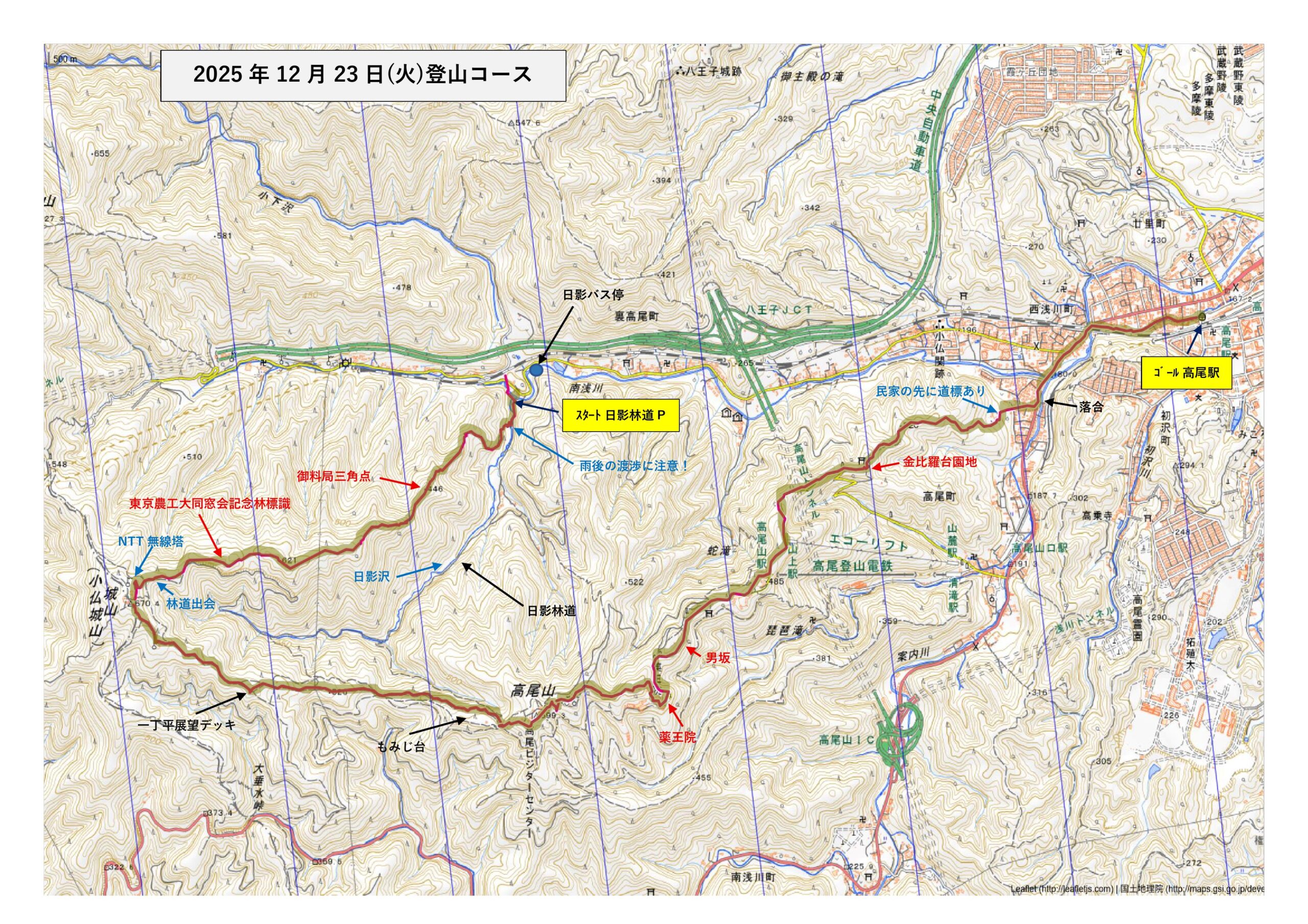 JR高尾駅 ⇒ 日影バス停 → P620m → 城山 → 一丁平 → 高尾山 → ケーブル駅 → 金比羅台園地 → 落合 → JR高尾駅