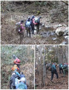 その後、高尾駅から10分ほどの日影バス停で下車後、日影林道の入口からCLの挨拶と注意事項を聞いて、同林道を少し歩いて、途中で日影沢に降りて渡渉後、本日のバリエーションコースによる山行が始まった。
