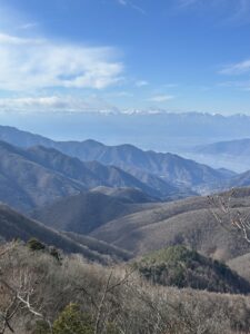 滝子山山頂目前で、リーダーがいい景色だよー!って大きな声。ハアハアしながら登ると、澄んだ空の下、やまなみの向こうに真っ白な山々が見える。なんて綺麗なんだろう!こういうご褒美があるから山登りはやめられない!