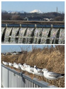スタートは洪水のために流れ着いた観音像を祀った白衣観音堂。ここは対岸に渡る菅の渡し場でもあり、上流の羽村から下流の六郷まで材木を運ぶ3泊4日のいかだ流しの宿場町としても賑わった所です。この先、下流にある江戸時代に造られた多摩川の二ケ領上河原堰の魚道にも立ち寄りましたが、鮎の姿は皆無で代わりに多くの白いユリカモメが飛んでいました。
