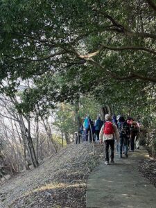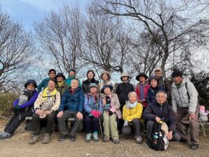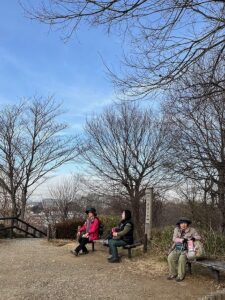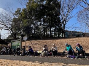 歩き始めは沿道に、ニュータウンらしい洒落た民家もあるが、次第に緑ばかりの尾根一本道歩き、やがて一本杉公園に到着。敷地には古民家や池があり、整備されていてとにかく広い。ポカポカ陽気の中、ここでのんびり弁当を広げる。周りには高校や大企業が所有するグラウンド、その先にはいくつかの大学のキャンパスが延々と続く。人口密度が低く、人とのすれ違いも極端に少ない。