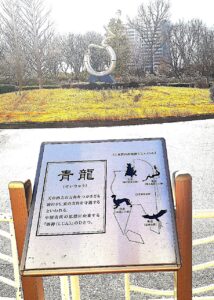東大島駅を降りると四神(しじん)の一つで東方面を守る巨大な「青龍」像が目に着きます。ここは江東区なので江東区役所を中心と見立てて設置されたものです。ちなみに、江東区の名前のいわれは、各種の説がありますが、「江」は隅田川をさし、隅田川の東にあるので江東区と命名されたそうです。日本の物語文学の原点ともいわれている「伊勢物語」でも奈良・平安時代には辺鄙な武蔵の国の中で「隅田川」が紹介されている位ですから、納得ですね。