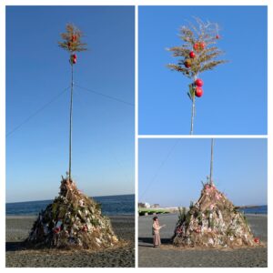 最後は西湘バイパスの地下道を抜けて海岸へ。青い空ときれいな海、砂利の浜辺を歩いていくと、ややっ、なにやら不思議なものが? そばに行ってみると正月飾りなどが円錐形にうず高く積み上げられ、真ん中に10mくらいの一本の竹、その先にはダルマがいくつもぶら下がっている。何、これ? リーダーの説明ではサギチョウ??といって、どんど焼き、お焚き上げのことだそうだ。大磯のサギチョウ(左義長)は有名でちょうど17日の夜に行われるのでその準備らしい。