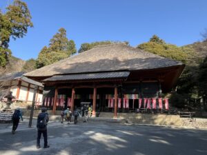 日向薬師まで、林道と長い参道を登りつめると、茅葺き屋根の趣きのある本殿が現れた。日向薬師は日本三大薬師の一つで奈良時代に行基が開山している。(写真①)