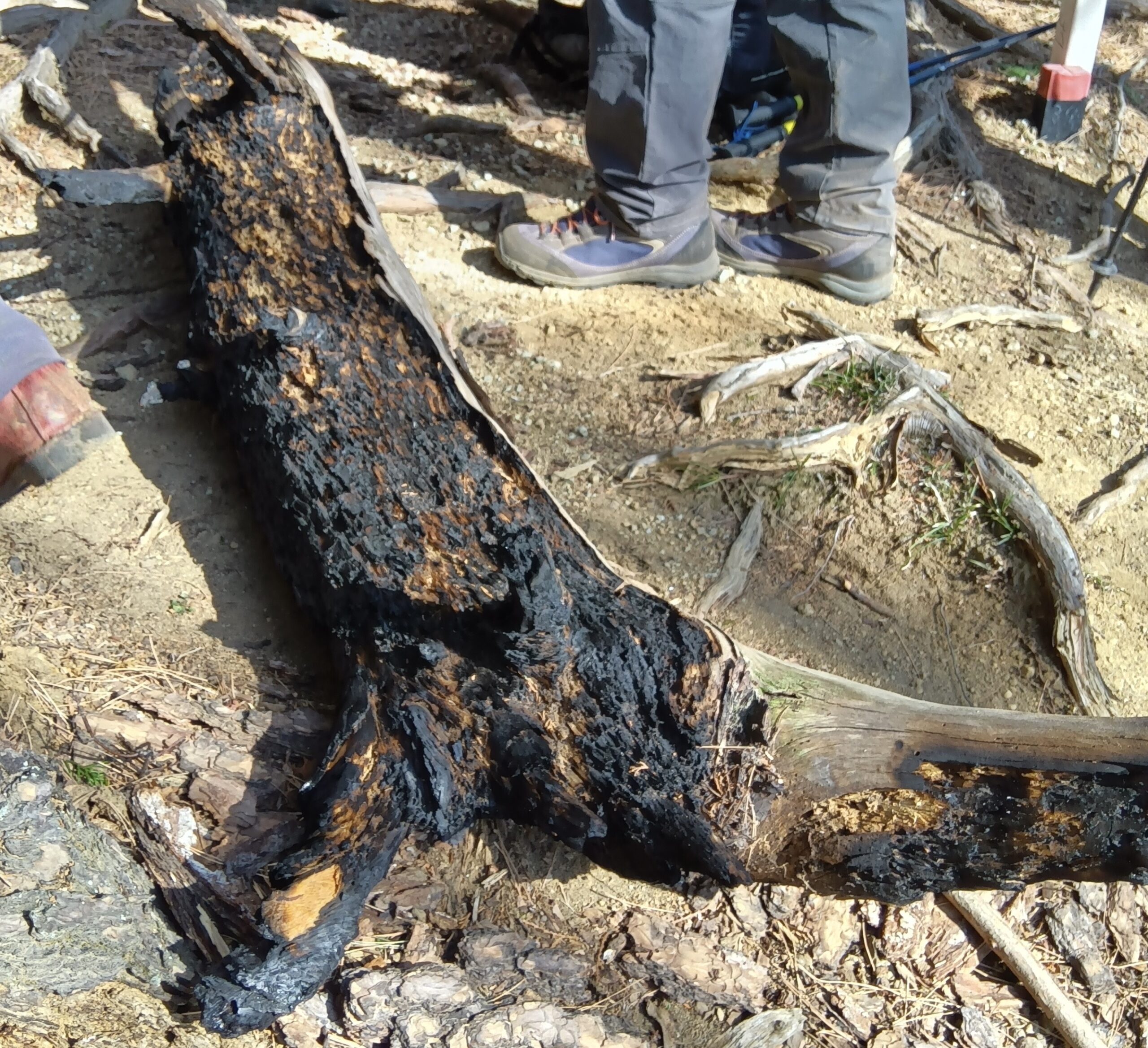 リーダーが日向山の山火事の話をしていると、ニノ沢ノ頭付近で飛び火した丸焦げの倒木を発見‼️(写真④)