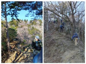 尾根を通り過ぎても、また木の根が浮き出していて段差が高い急登だ。「間あけて、手も使って」と声がかかる。(写真⑥)