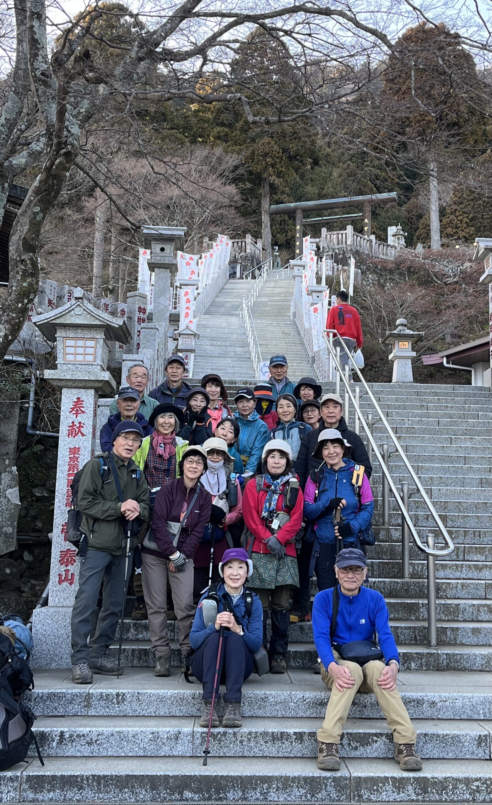 日も暮れ、リーダーの判断で女坂を諦め、16時のケーブルを使い、参道を歩き大山ケーブルバス停へ。盛り沢山の長い一日だった。