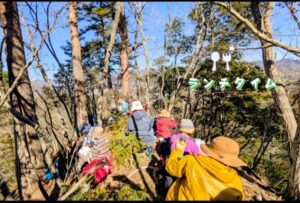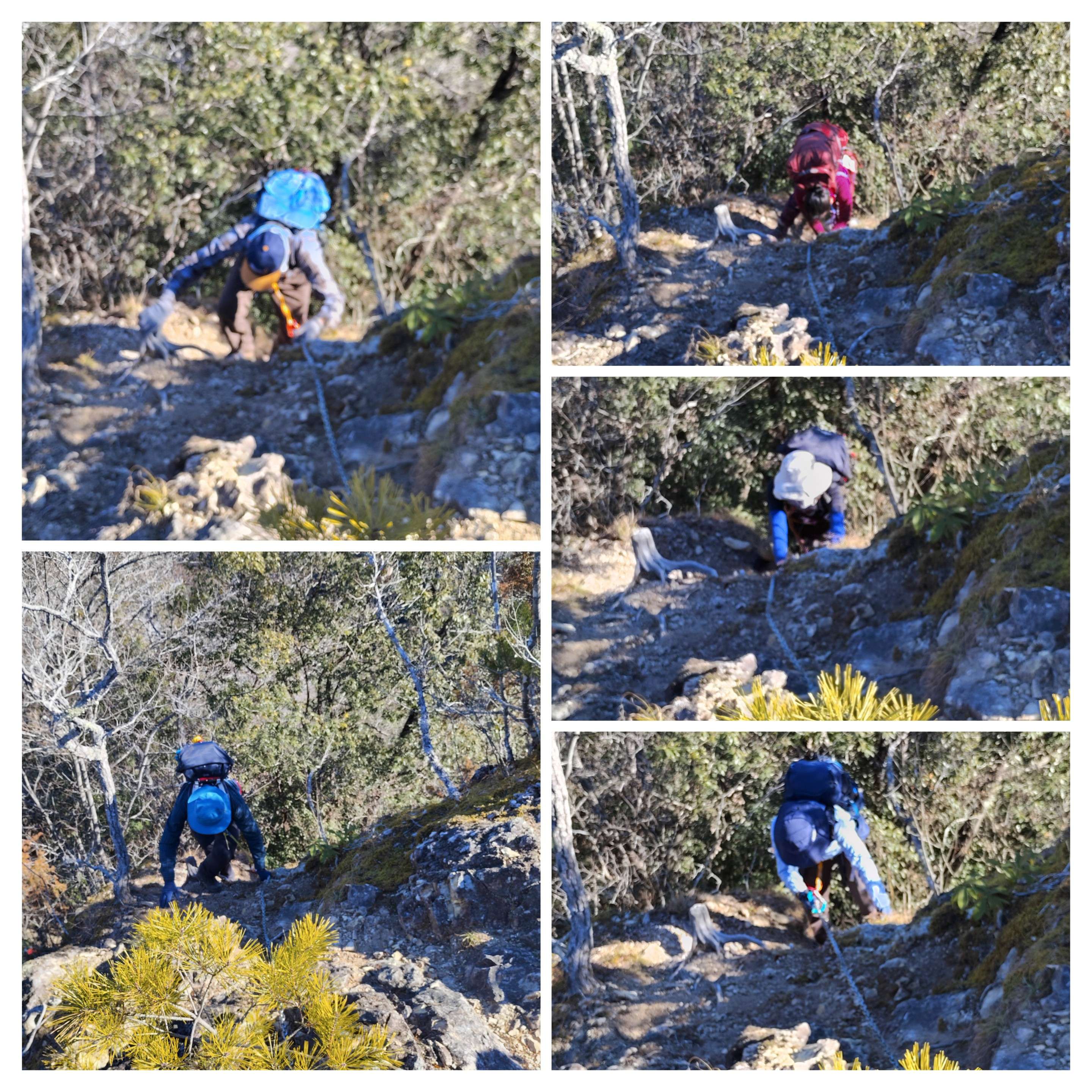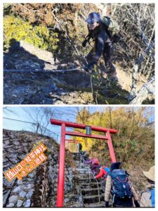 急登の始まる琴平神社でチェストハーネスを装着。事前にリーダーより教えていただいた簡易ハーネスの結び方の教材でおさらいしていたので、久しぶりにテープスリングで簡易ハーネスを組むまでは想定内であったが、ロープスリングの方は結び目を解いてあった事に気がついて、慌ててエイトノットで結ぼうとしてもたついていると隣の仲間が親切に正規のダブルフィッシャーマンズを教えてくれた(反省!)。