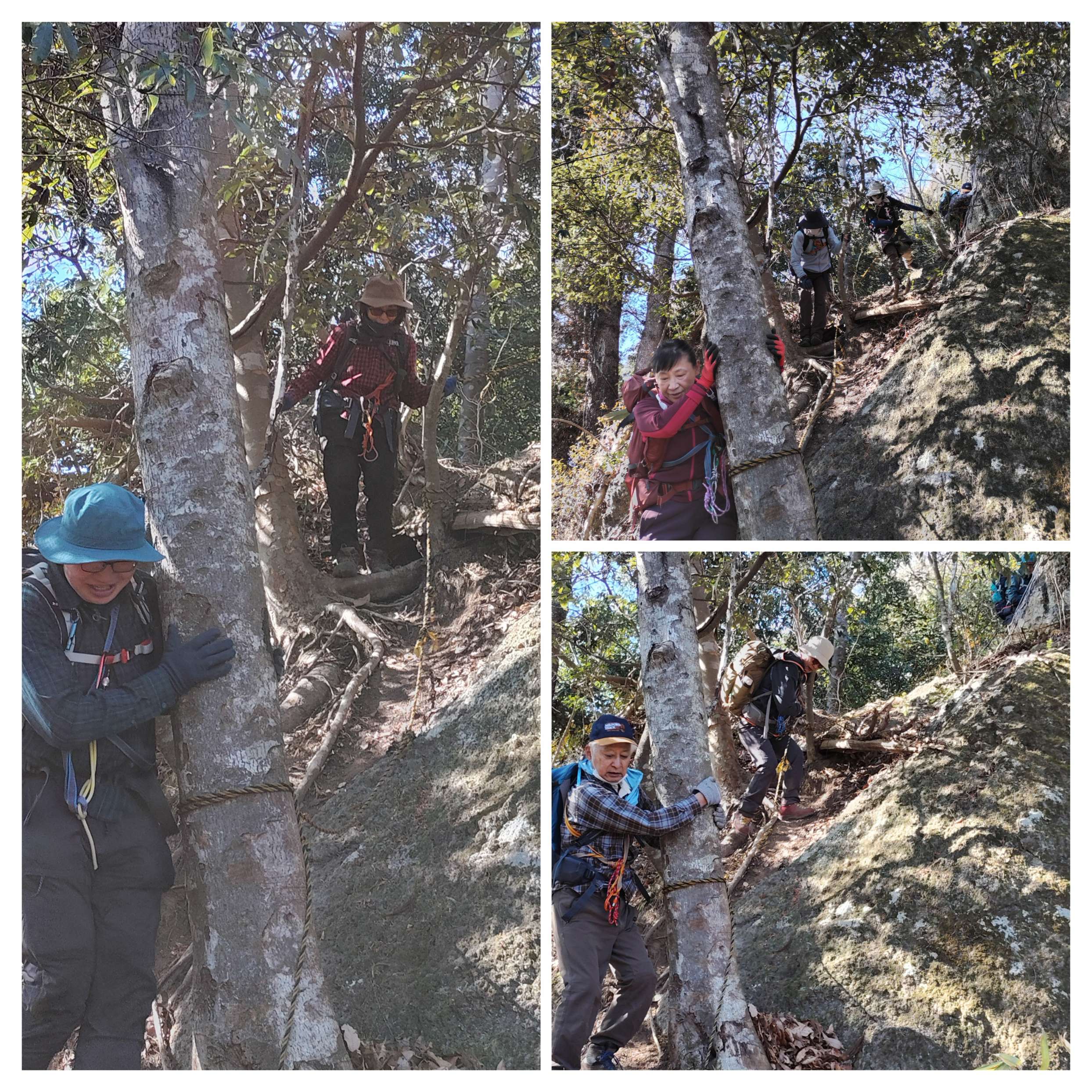 琴平山は380mの低山とはいえ久々に這いつくばるような登りの連続であった。続く剣ヶ峰山頂までは幾度か鎖場やロープでセルフビレイの実践練習をしながら緊張感を持って安全確保しながらの登山となった。下りも痩せ尾根が続き、危険な箇所にはロープも設置されているが、緊張感を持って慎重に足と体のバランスを意識する時間が長かったような気がした。