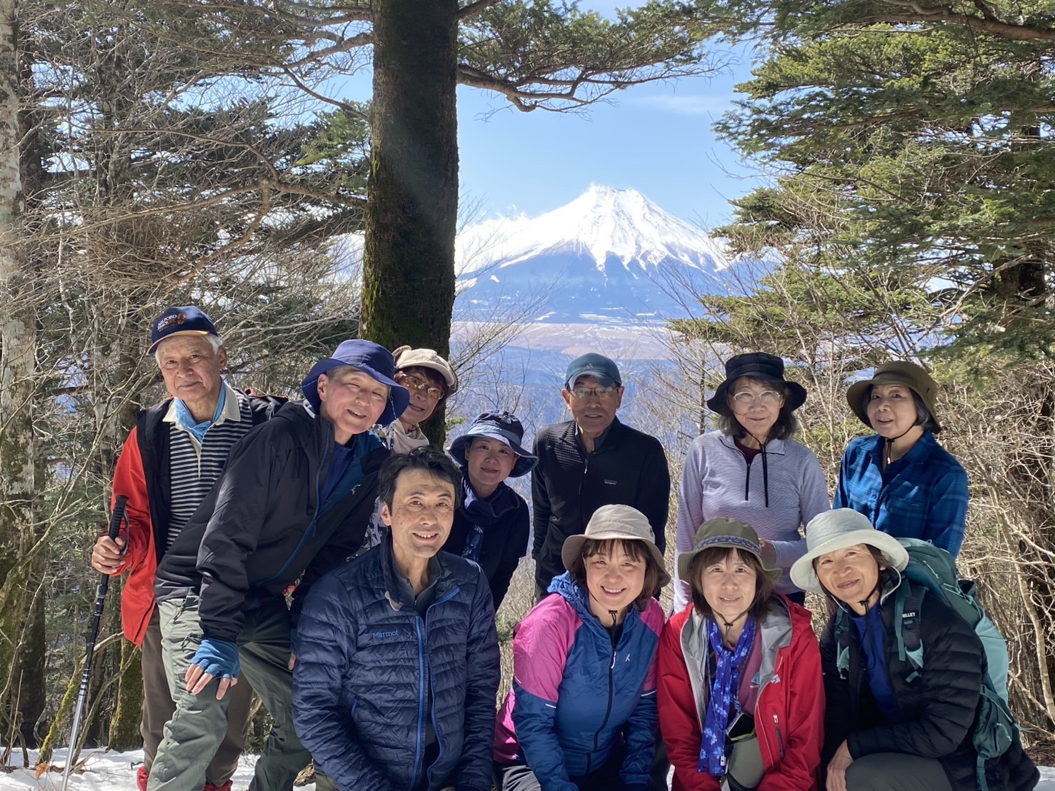 我らがリーダーが重いザックを背負い先頭を歩く背中は頼もしいのだ。その後、先頭を交代しながら歩くが、一歩進む度に雪がわんさかアイゼンにまとわりつき着地が安定せず、思うように進まず苦戦。そんな中、あちこちから「やっぱり雪山はいいわねえ」の声が上がる。先輩、さすがです。1時間半ほど必死で歩き展望台へ。目の前には白く輝く富士のお山が!眼福です!ご馳走様です!