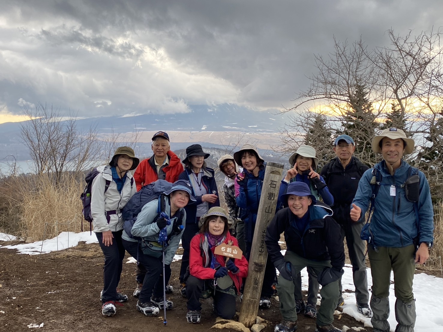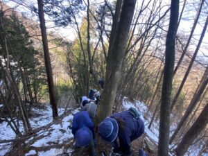 痩せ尾根を渡り、傾斜を下り、登って降りて登って降りて、ヘロヘロになり何とか石割山へ。さあ、バスの時間に間に合うように最後ひと踏ん張り!チーム一丸となり下山。ようやくアイゼンが外せたのはゴール近く。