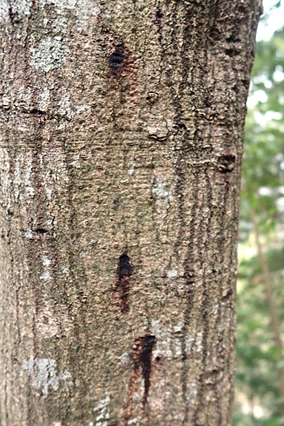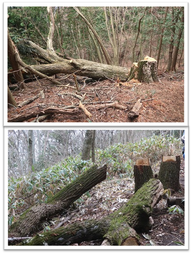 一方で、ナラ枯れによる倒木や伐採された木を沢山見ました。ナラ枯れは、カシノナガキクイムシが持ち込む菌が、木から栄養を吸収し、樹液の上昇を妨げることにより起こる感染症です。枯れない迄も、カシノナガキクイムシが開けた孔から樹液が漏出した木や、理由は不明ですが丸裸になった木もありました。薪炭として使われなくなり放置された高齢で大径木のナラが感染の拡がりの一因とのことで、森林にも高齢化問題が押し寄せていることを知りました。