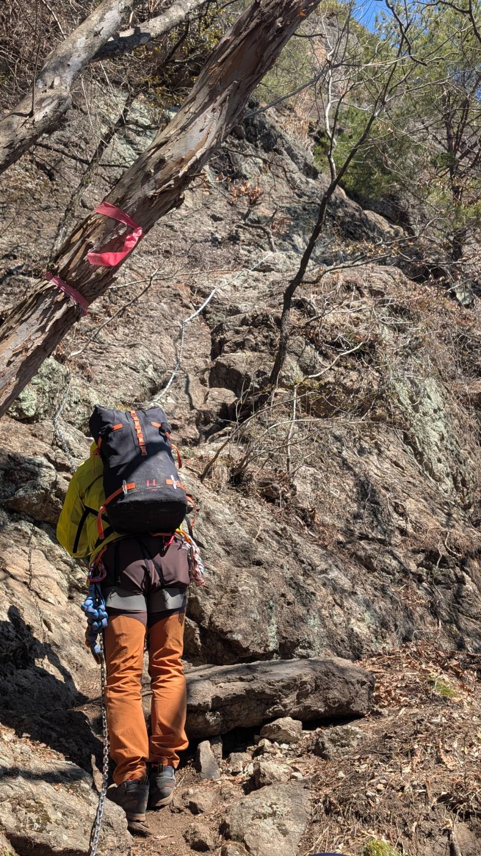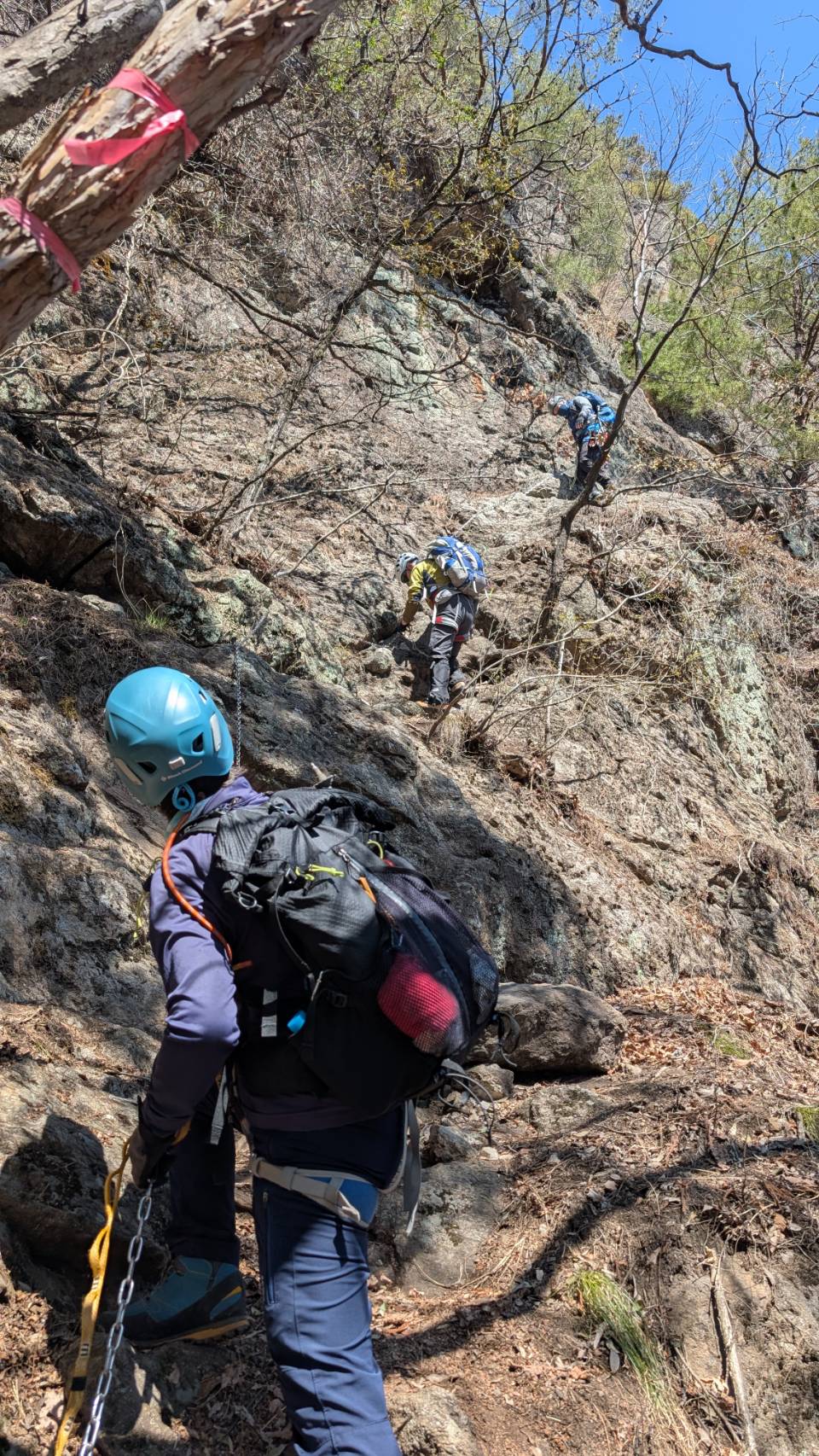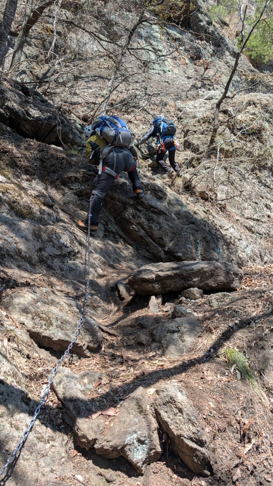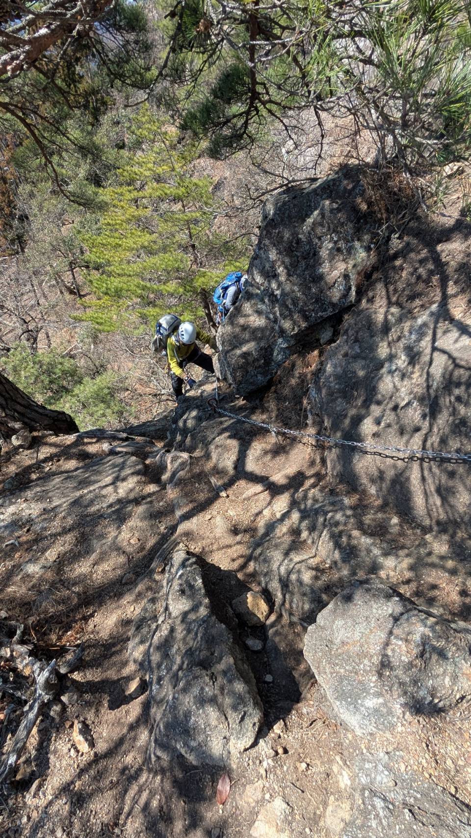 下りは同じ道を下って行く。ゆっくり、慎重に、自然と鎖を握る手に力が入る。手に汗握りながらクライムダウン。下り終わったらホッとひと安心。